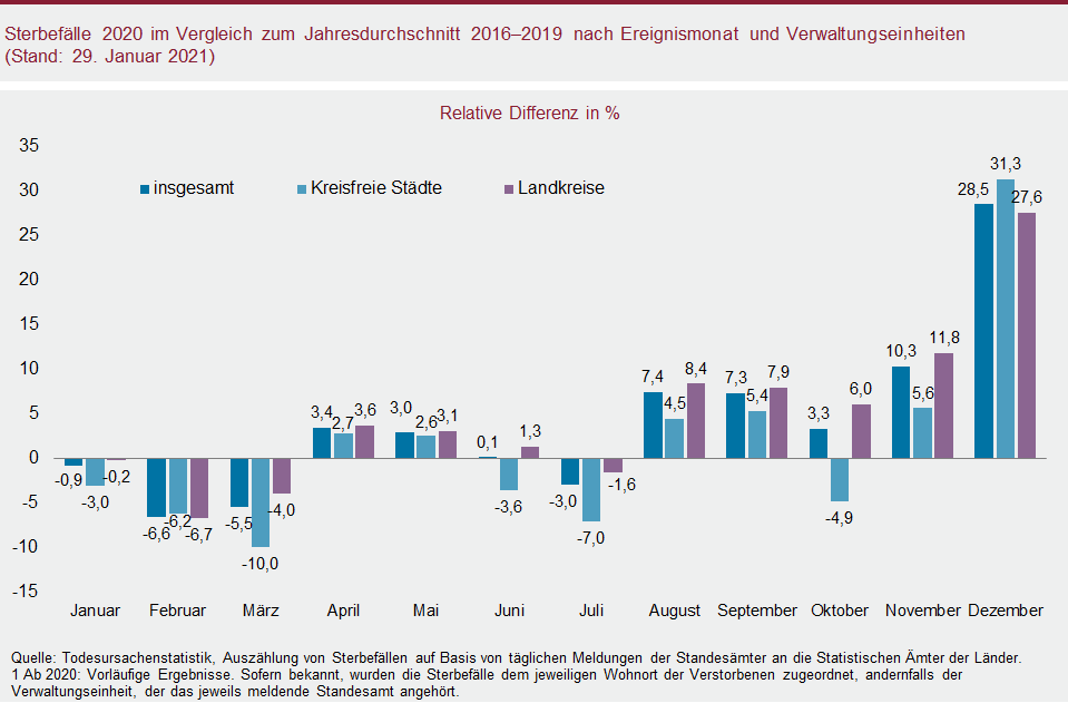 Die aktuell rückläufigen COVID-19-Infektionszahlen schlagen sich noch nicht in den vorläufigen Daten der amtlichen Sterbefallstatistik nieder. Da zwischen Erkrankungsbeginn und Todeszeitpunkt in Verbindung mit einer COVID-19-Infektion in der Regel ein Zeitverzug von mehreren Tagen bzw. Wochen liegen kann, ist dies frühestens für den Berichtsmonat Februar zu erwarten.