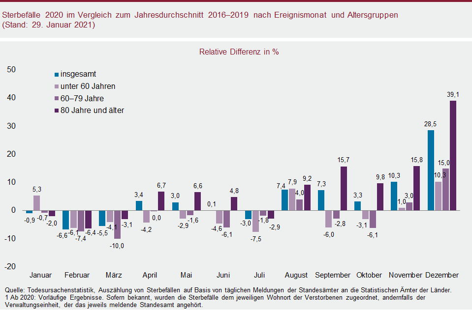 Der Anstieg der Sterbefallzahlen im Jahr 2020 geht vor allem auf die Gruppe der 80-Jährigen und Älteren zurück, die auch ein erhöhtes Sterblichkeitsrisiko in Verbindung mit einer COVID-19-Erkrankung hat. Während die Zahl der Sterbefälle 2020 sowohl in der Gruppe der unter 60-Jährigen (minus 1,2 Prozent) als auch in der Gruppe der 60- bis unter 80-Jährigen (minus 1,3 Prozent) geringer ausfiel als im mehrjährigen Durchschnitt, lag die Zahl der Gestorbenen unter den 80-Jährigen und Älteren erkennbar höher (plus 7,5 Prozent). Das gilt insbesondere für das vierte Quartal 2020, in dem die Zahl der Gestorbenen unter den 80-Jährigen und Älteren um mehr als ein Fünftel über dem Durchschnitt der vier Vorjahre lag (plus 22 Prozent). Im Dezember 2020 waren es sogar knapp zwei Fünftel mehr (plus 39 Prozent). Eine erhöhte Sterblichkeit kann zum Jahresende aber auch für die beiden anderen Altersgruppen festgestellt werden. Bei den unter 60-Jährigen lag sie im vierten Quartal um 3 Prozent über dem Durchschnitt der Vorjahre (Dezember 2020: plus 10 Prozent) und bei den 60- bis unter 80-Jährigen um 4,2 Prozent (Dezember 2020: plus 15 Prozent).
