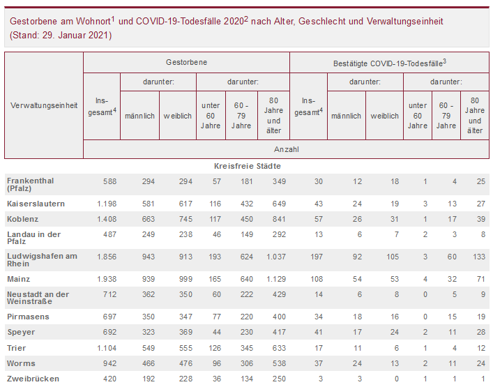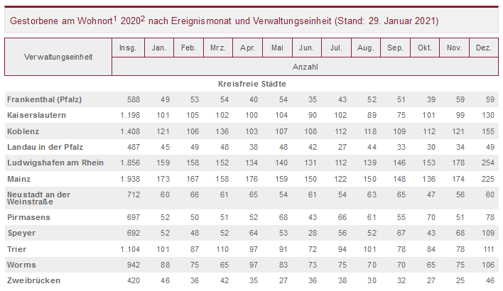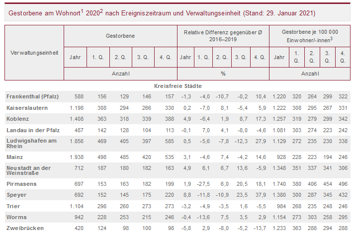 Insgesamt fiel die Zahl der Sterbefälle in fünf kreisfreien Städten und in zwei Landkreisen niedriger aus als im Mittel der Jahre 2016 bis 2019. Am günstigsten entwickelte sich die Zahl der Sterbefälle in der kreisfreien Stadt Zweibrücken (minus 5,8 Prozent), am ungünstigsten dagegen im Rhein-Pfalz-Kreis, in dem 2020 gut 13 Prozent mehr Verstorbene als im mehrjährigen Mittel gezählt wurden. Im vierten Quartal 2020 fiel die Zahl der Sterbefälle gegenüber den Vorjahren nur noch in vier kreisfreien Städten sowie in zwei Landkreisen niedriger aus. Am niedrigsten war sie auch in diesem Zeitraum in der kreisfreien Stadt Zweibrücken (minus 14 Prozent). In den meisten kreisfreien Städten und in den meisten Landkreisen fiel sie am Jahresende aber deutlich höher aus. Am stärksten nahmen die Sterbefälle zwischen Oktober und Dezember 2020 im Rhein-Pfalz-Kreis zu (plus 39 Prozent).