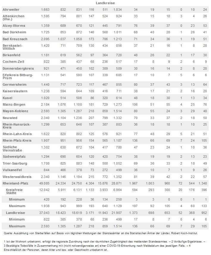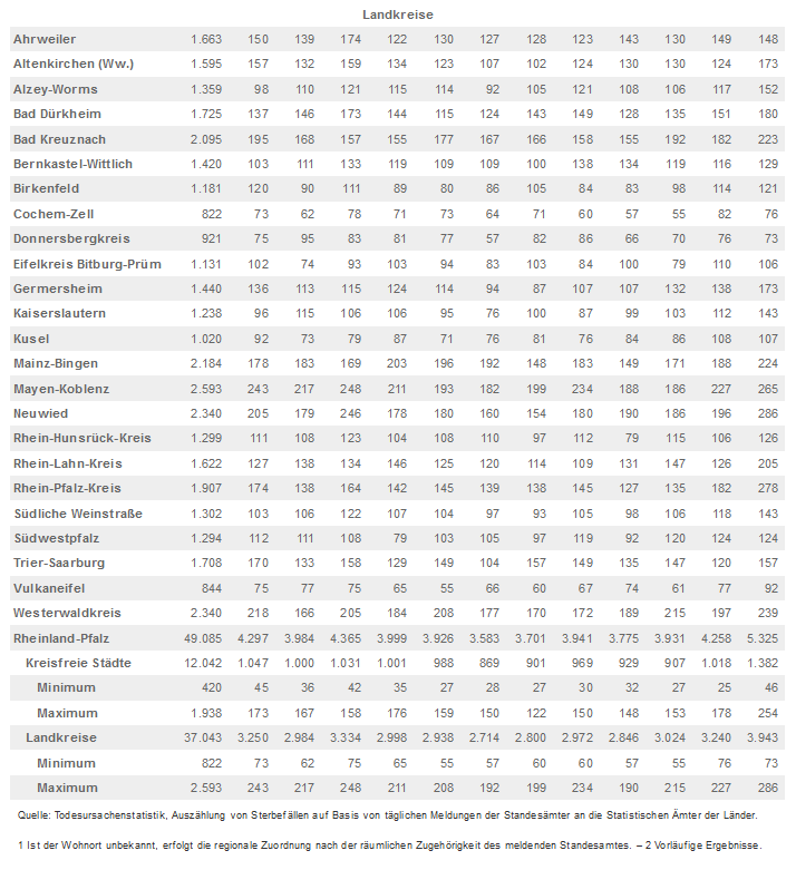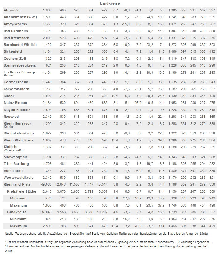 Regional nahm die Entwicklung der Sterbefallzahlen einen sehr unterschiedlichen Verlauf. Gemessen an der Einwohnerzahl starben 2020 die meisten Rheinland-Pfälzerinnen und Rheinland-Pfälzer in der kreisfreien Stadt Pirmasens (1.740 Sterbefälle je 100.000 Einwohnerinnen und Einwohner), die wenigsten in der Landeshauptstadt Mainz (928 Sterbefälle je 100.000 Einwohnerinnen und Einwohner). Zu beachten ist, dass die unterschiedliche regionale Entwicklung der Sterbefälle grundsätzlich auch auf die unterschiedliche Alters- und Geschlechtsstruktur der Bevölkerung zurückzuführen ist.