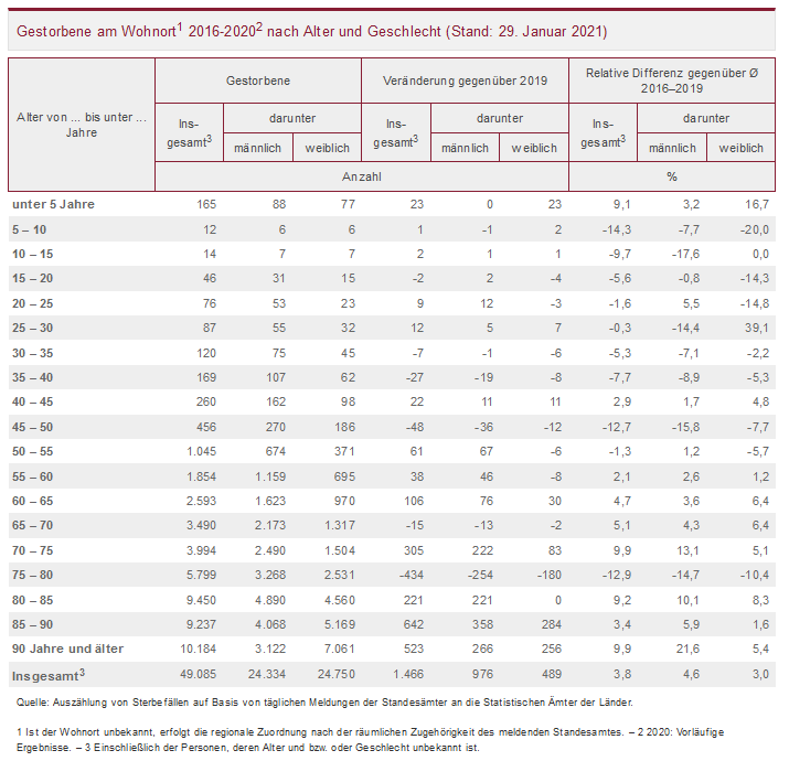 Die Ergebnisse dieser Pressemitteilung zu den Sterbefallzahlen 2016 bis 2020 beruhen auf einer Sonderauswertung der täglichen Meldungen der Standesämter an die Statistischen Ämter der Länder. Sie sind noch nicht endgültig plausibilisiert und aufgrund des zu erwartenden Meldeverzugs seitens der Berichtsstellen möglicherweise noch nicht vollständig. Deshalb sind die Ergebnisse vorläufig. Abweichungen gegenüber den endgültigen Ergebnissen, wie sie für die Berichtsjahre bis 2019 bereits vorliegen, können sich insbesondere für kürzer zurückliegende Berichtszeiträume ergeben.