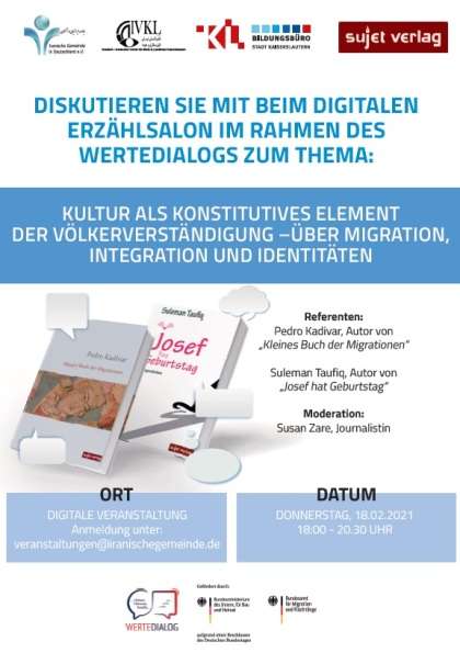 Die Iranische Gemeinde in Deutschland e.V. (IGD) veranstaltet gemeinsam mit dem Deutsch-Iranischen Verein für Stadt und Landkreis Kaiserslautern e.V. (DIVKL), dem Bildungsbüro der Stadt Kaiserslautern und dem Sujet-Verlag am 18. Februar 2021 einen digitalen Erzählsalon zum Thema: “Kultur als konstitutives Element der Völkerverständigung – über Migration, Integration und Identitäten“. Die Veranstaltung startet um 18 Uhr, Anmeldungen sind bis 15. Februar möglich. Die Teilnahme ist kostenlos.
