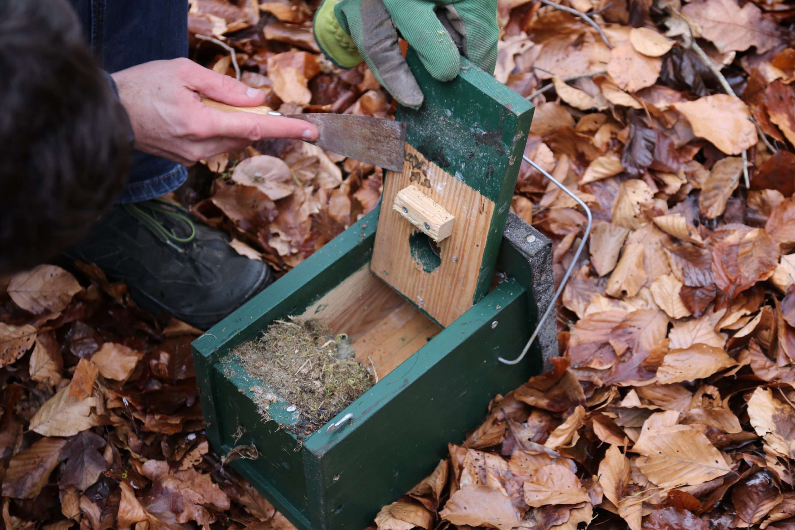 Bild Reinigung Nistkasten: Nistkästen, die als Behausung im letzten Sommer dienten, wurden gereinigt und und wieder am Baum angebracht