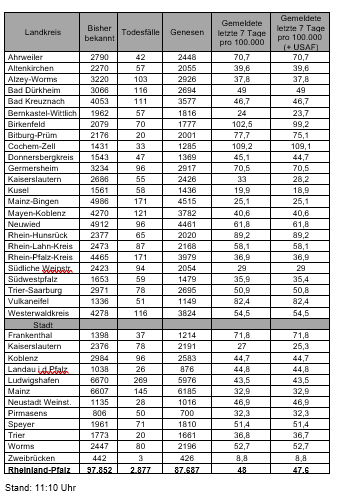 Die oben genannten Zahlen entsprechen den in der Meldesoftware des Robert Koch-Instituts übermittelten laborbestätigten Fällen einer COVID-19 Erkrankung mit Meldeadresse in Rheinland-Pfalz. Diese werden von den Gesundheitsämtern über die Landesmeldestelle beim Landesuntersuchungsamt an das Robert Koch-Institut übermittelt. Diese Zahlen können vereinzelt von den durch die Kreisverwaltungen kommunizierten Zahlen abweichen.