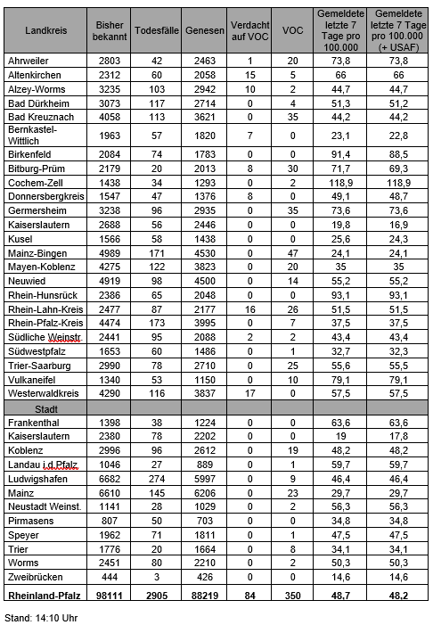 Die oben genannten Zahlen entsprechen den in der Meldesoftware des Robert Koch-Instituts übermittelten laborbestätigten Fällen einer COVID-19 Erkrankung mit Meldeadresse in Rheinland-Pfalz. Diese werden von den Gesundheitsämtern über die Landesmeldestelle beim Landesuntersuchungsamt an das Robert Koch-Institut übermittelt. Diese Zahlen können vereinzelt von den durch die Kreisverwaltungen kommunizierten Zahlen abweichen.