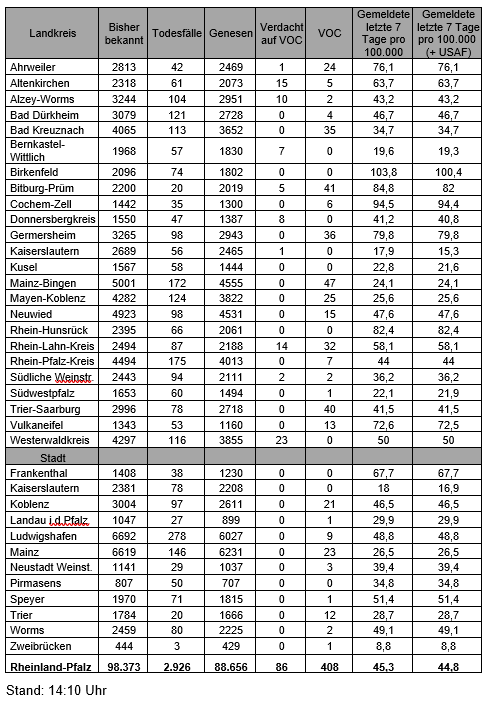 Die oben genannten Zahlen entsprechen den in der Meldesoftware des Robert Koch-Instituts übermittelten laborbestätigten Fällen einer COVID-19 Erkrankung mit Meldeadresse in Rheinland-Pfalz. Diese werden von den Gesundheitsämtern über die Landesmeldestelle beim Landesuntersuchungsamt an das Robert Koch-Institut übermittelt. Diese Zahlen können vereinzelt von den durch die Kreisverwaltungen kommunizierten Zahlen abweichen.