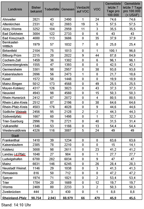 Die oben genannten Zahlen entsprechen den in der Meldesoftware des Robert Koch-Instituts übermittelten laborbestätigten Fällen einer COVID-19 Erkrankung mit Meldeadresse in Rheinland-Pfalz. Diese werden von den Gesundheitsämtern über die Landesmeldestelle beim Landesuntersuchungsamt an das Robert Koch-Institut übermittelt. Diese Zahlen können vereinzelt von den durch die Kreisverwaltungen kommunizierten Zahlen abweichen.