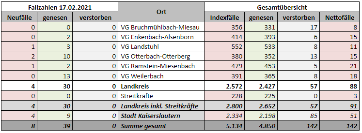 5.134 Indexfälle in Stadt und Landkreis, 4.850 genesenen Personen, 142 Todesfälle, 17.02.2021