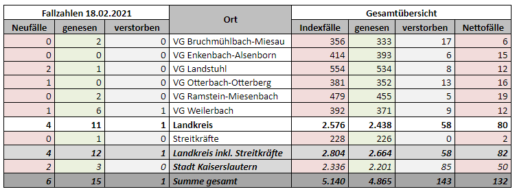5.140 Indexfälle in Stadt und Landkreis, 4.865 genesenen Personen, 143 Todesfälle, 18.02.2021