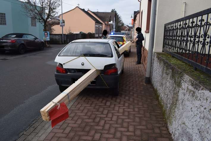 Beamten der Autobahnpolizei Kaiserslautern fiel am Freitagmorgen auf der A62 an der Anschlussstelle Hütschenhausen ein Peugeot 106 auf, der in abenteuerlicher Weise zehn Holzbalken transportierte. Bei der anschließenden Verkehrskontrolle in Spesbach staunten die Polizisten nicht schlecht. Der Fahrer hatte die fünf Meter lange Ladung durch das gesamte Fahrzeug über die geöffnete Heckklappe und das Seitenfenster der Beifahrertür geladen. Dem 69 jährigen Mann wurde die Weiterfahrt untersagt. Gegen ihn wurde ein Bußgeldverfahren eingeleitet.|past