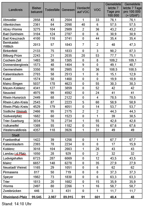Die oben genannten Zahlen entsprechen den in der Meldesoftware des Robert Koch-Instituts übermittelten laborbestätigten Fällen einer COVID-19 Erkrankung mit Meldeadresse in Rheinland-Pfalz. Diese werden von den Gesundheitsämtern über die Landesmeldestelle beim Landesuntersuchungsamt an das Robert Koch-Institut übermittelt. Diese Zahlen können vereinzelt von den durch die Kreisverwaltungen kommunizierten Zahlen abweichen.