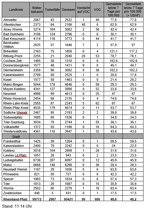 Die oben genannten Zahlen entsprechen den in der Meldesoftware des Robert Koch-Instituts übermittelten laborbestätigten Fällen einer COVID-19 Erkrankung mit Meldeadresse in Rheinland-Pfalz. Diese werden von den Gesundheitsämtern über die Landesmeldestelle beim Landesuntersuchungsamt an das Robert Koch-Institut übermittelt. Diese Zahlen können vereinzelt von den durch die Kreisverwaltungen kommunizierten Zahlen abweichen.