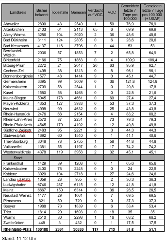Die oben genannten Zahlen entsprechen den in der Meldesoftware des Robert Koch-Instituts übermittelten laborbestätigten Fällen einer COVID-19 Erkrankung mit Meldeadresse in Rheinland-Pfalz. Diese werden von den Gesundheitsämtern über die Landesmeldestelle beim Landesuntersuchungsamt an das Robert Koch-Institut übermittelt. Diese Zahlen können vereinzelt von den durch die Kreisverwaltungen kommunizierten Zahlen abweichen.