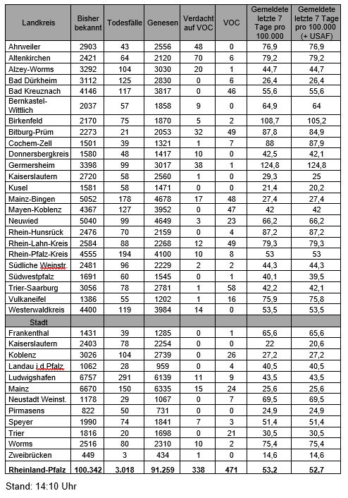 Die oben genannten Zahlen entsprechen den in der Meldesoftware des Robert Koch-Instituts übermittelten laborbestätigten Fällen einer COVID-19 Erkrankung mit Meldeadresse in Rheinland-Pfalz. Diese werden von den Gesundheitsämtern über die Landesmeldestelle beim Landesuntersuchungsamt an das Robert Koch-Institut übermittelt. Diese Zahlen können vereinzelt von den durch die Kreisverwaltungen kommunizierten Zahlen abweichen.