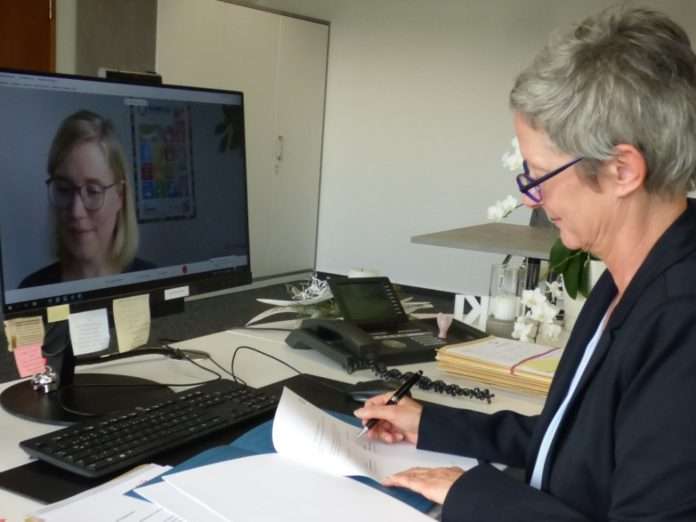BILD (Copyright Stadt Kaiserslautern / BNE-Kompetenzzentrum): Bürgermeisterin Beate Kimmel (r.) und Dr. Lea Schütze, Leiterin des Standorts Süd des BNE-Kompetenzzentrums in München, unterzeichnen die Zielvereinbarung.