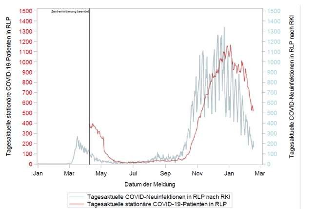 · COVID-19-Kapazitäts-Register: Im Rahmen der zweiten Pandemie-Welle hat parallel zu den Neuinfektionen mit SARS-CoV-2 in Rheinland-Pfalz auch die Anzahl der Patienten mit stationärer Behandlungspflichtigkeit deutlich zugenommen, im Januar mussten z.T. mehr als 1.100 Patienten täglich in den Krankenhäusern in Rheinland-Pfalz behandelt werden, mehr als ein Viertel davon auf Intensivstationen.