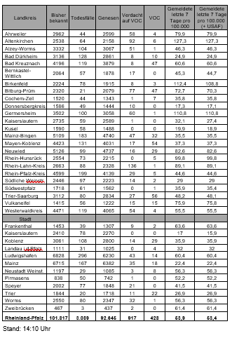 Die oben genannten Zahlen entsprechen den in der Meldesoftware des Robert Koch-Instituts übermittelten laborbestätigten Fällen einer COVID-19 Erkrankung mit Meldeadresse in Rheinland-Pfalz. Diese werden von den Gesundheitsämtern über die Landesmeldestelle beim Landesuntersuchungsamt an das Robert Koch-Institut übermittelt. Diese Zahlen können vereinzelt von den durch die Kreisverwaltungen kommunizierten Zahlen abweichen.