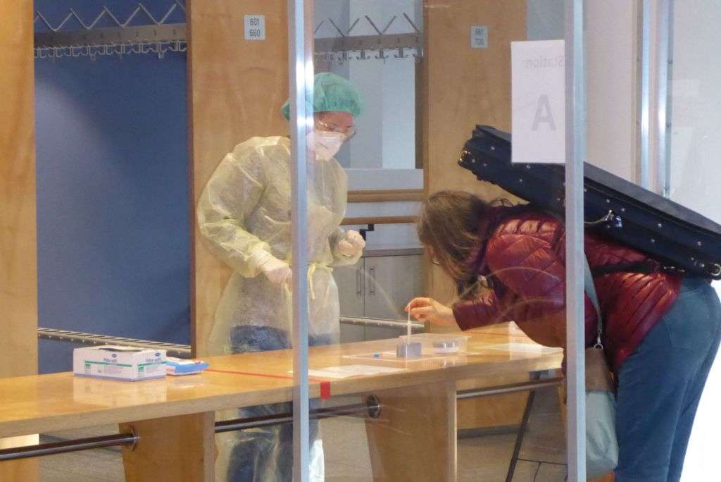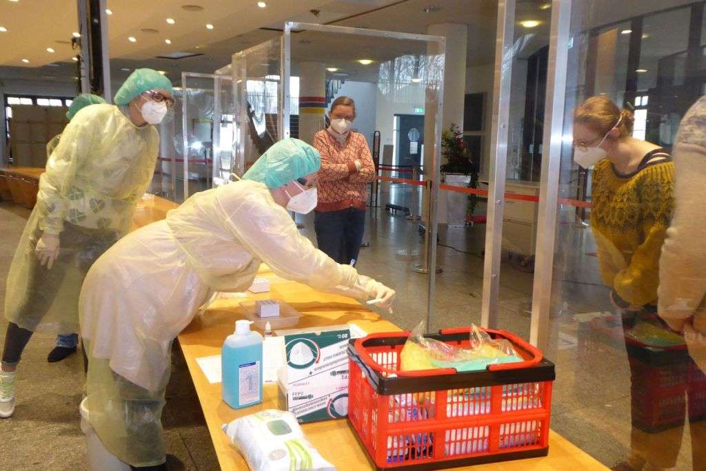 Mit dem Probebetrieb, der im Pfalztheater Kaiserslautern wieder aufgenommen wurde, besteht nun zweimal die Woche für die Beschäftigten die Möglichkeit, sich testen zu lassen. Für die sogenannten Antigen-Schnelltests hat eine Gesundheits- und Krankenpflegerin des Pfalzklinikums 15 Helferinnen und Helfer des Pfalztheaters speziell eingewiesen, und zwar zunächst theoretisch anhand einer Präsentation und Hygieneschulung sowie praktisch für den Ablauf eines Tests: Dabei nimmt sich jede Testperson kontaktlos zum Testhelfer selbst den Abstrich aus der Nase, der dann von den Helfern in eine Pufferlösung gegeben und in die Testkassette getropft wird.
