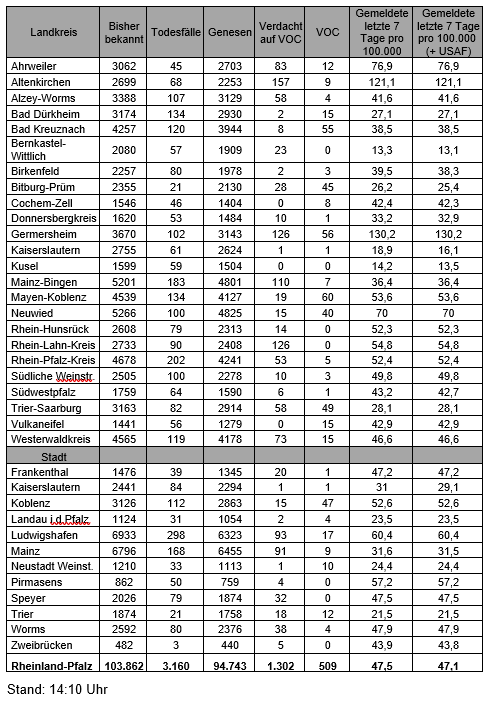 Die oben genannten Zahlen entsprechen den in der Meldesoftware des Robert Koch-Instituts übermittelten laborbestätigten Fällen einer COVID-19 Erkrankung mit Meldeadresse in Rheinland-Pfalz. Diese werden von den Gesundheitsämtern über die Landesmeldestelle beim Landesuntersuchungsamt an das Robert Koch-Institut übermittelt. Diese Zahlen können vereinzelt von den durch die Kreisverwaltungen kommunizierten Zahlen abweichen.