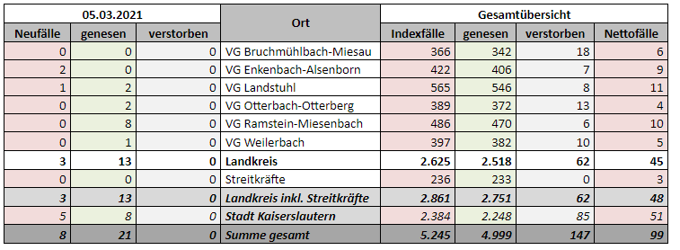 5.245 Indexfälle in Stadt und Landkreis, 4.999 genesenen Personen, 147 Todesfälle, 05.03.2021