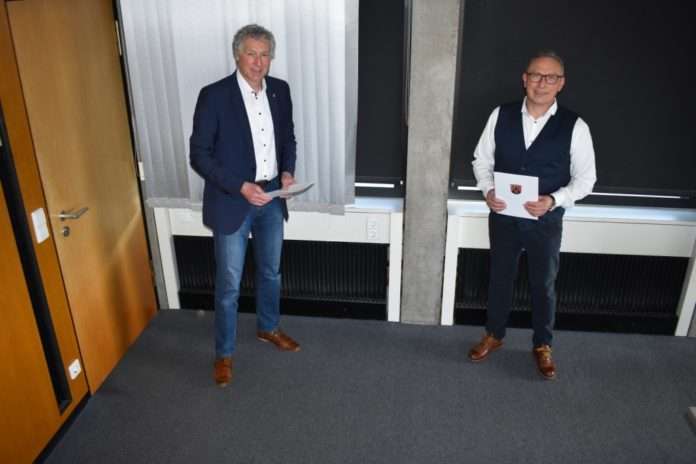 Bild: Beigeordneter Peter Kiefer (links) überreicht Michael Deppert die Urkunde zum 40. Dienstjubiläum.