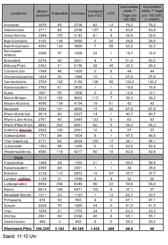 Die oben genannten Zahlen entsprechen den in der Meldesoftware des Robert Koch-Instituts übermittelten laborbestätigten Fällen einer COVID-19 Erkrankung mit Meldeadresse in Rheinland-Pfalz. Diese werden von den Gesundheitsämtern über die Landesmeldestelle beim Landesuntersuchungsamt an das Robert Koch-Institut übermittelt. Diese Zahlen können vereinzelt von den durch die Kreisverwaltungen kommunizierten Zahlen abweichen.
