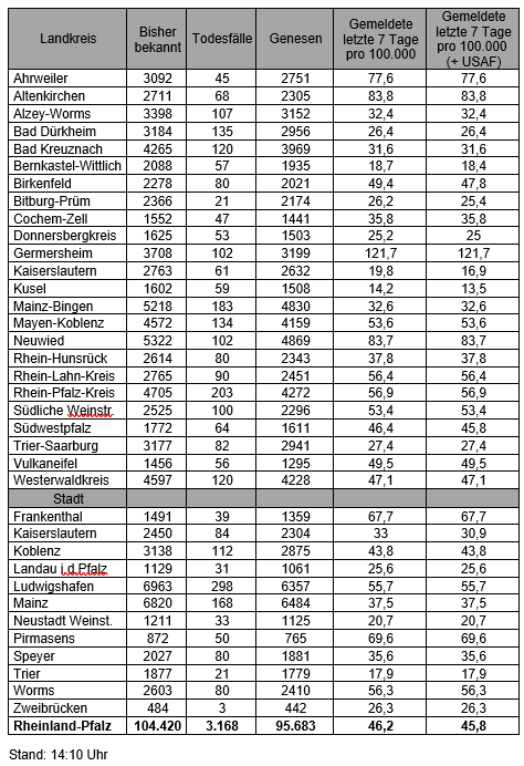 Die oben genannten Zahlen entsprechen den in der Meldesoftware des Robert Koch-Instituts übermittelten laborbestätigten Fällen einer COVID-19 Erkrankung mit Meldeadresse in Rheinland-Pfalz. Diese werden von den Gesundheitsämtern über die Landesmeldestelle beim Landesuntersuchungsamt an das Robert Koch-Institut übermittelt. Diese Zahlen können vereinzelt von den durch die Kreisverwaltungen kommunizierten Zahlen abweichen.
