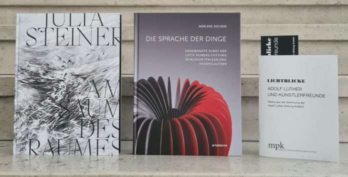 132 Artefakte aus Textil, Metall, Holz, Papier, Leder und Glas von 49 Künstlerinnen und Künstlern verdeutlichen den Variantenreichtum des Kunsthandwerks. Der Sonderpreis beträgt 29,90 Euro. Der 80-seitige, zweisprachige Katalog „Julia Steiner – Am Saum des Raumes“ (deutsch/englisch, 24 Euro) dokumentiert mit zahlreichen, zum Teil doppelseitigen Fotografien die raumgreifenden Arbeiten der Schweizer Künstlerin. Ihre großformatigen Pinselzeichnungen wachsen – sobald auf die Wand gesetzt – zur monumentalen Größe. Und doch strahlen sie etwas flüchtig Zartes aus und machen abstrakte Begriffe wie „Raum und Zeit“ sowie „Bewegung und Vergänglichkeit“ (be-)greifbar. „Lichtblicke – Adolf Luther und Künstlerfreunde“ stellt die Op Art-Werke des bedeutenden Krefelder Künstlers und berühmter Künstlerfreunde, wie Lucio Fontana, Christo oder Yves Klein, vor – allesamt wegweisende Positionen der zweiten Hälfte des 20. Jahrhunderts. Rund 20 einzigartige, teilweise monumentale Wand- und Bodenarbeiten, die zwischen 1960 und 1990 entstanden, belegen Luthers variantenreiches Schaffen. Das Katalogheft im DIN A5-Format umfasst 98 Seiten und kostet acht Euro. Alle Publikationen des Museums Pfalzgalerie Kaiserslautern finden sich zusammen mit dem Bestellformular unter www.mpk.de/publikationen.html.