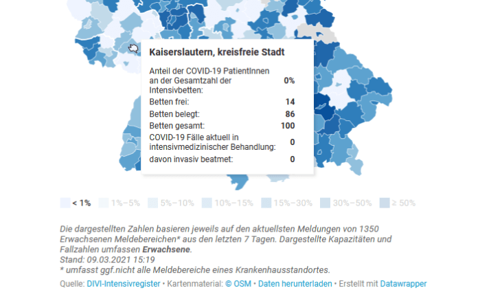 Aktuell werden 334 COVID-19-Patientinnen und -Patienten in den rheinland-pfälzischen Krankenhäusern behandelt. 68 von diesen werden intensivmedizinisch behandelt, 55 der intensivmedizinisch behandelten sind beatmungspflichtig. Insgesamt halten die rheinland-pfälzischen Krankenhäuser mehr als 1.600 Intensivbetten vor.
