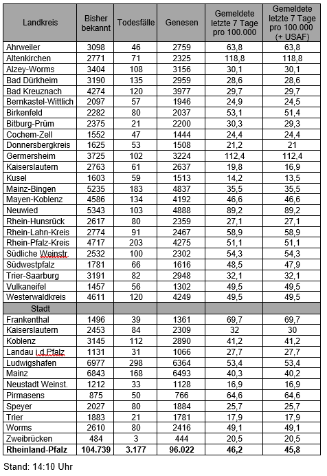 Die oben genannten Zahlen entsprechen den in der Meldesoftware des Robert Koch-Instituts übermittelten laborbestätigten Fällen einer COVID-19 Erkrankung mit Meldeadresse in Rheinland-Pfalz. Diese werden von den Gesundheitsämtern über die Landesmeldestelle beim Landesuntersuchungsamt an das Robert Koch-Institut übermittelt. Diese Zahlen können vereinzelt von den durch die Kreisverwaltungen kommunizierten Zahlen abweichen.