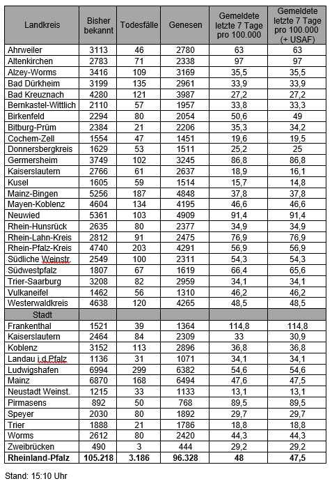 Die oben genannten Zahlen entsprechen den in der Meldesoftware des Robert Koch-Instituts übermittelten laborbestätigten Fällen einer COVID-19 Erkrankung mit Meldeadresse in Rheinland-Pfalz. Diese werden von den Gesundheitsämtern über die Landesmeldestelle beim Landesuntersuchungsamt an das Robert Koch-Institut übermittelt. Diese Zahlen können vereinzelt von den durch die Kreisverwaltungen kommunizierten Zahlen abweichen.