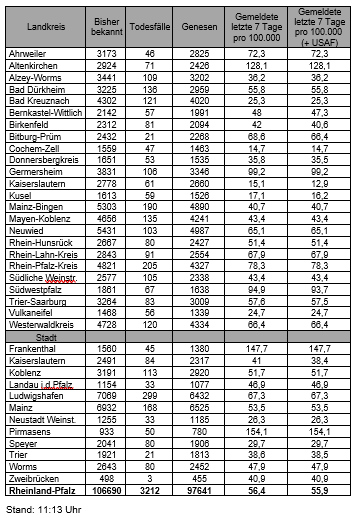 Die oben genannten Zahlen entsprechen den in der Meldesoftware des Robert Koch-Instituts übermittelten laborbestätigten Fällen einer COVID-19 Erkrankung mit Meldeadresse in Rheinland-Pfalz. Diese werden von den Gesundheitsämtern über die Landesmeldestelle beim Landesuntersuchungsamt an das Robert Koch-Institut übermittelt. Diese Zahlen können vereinzelt von den durch die Kreisverwaltungen kommunizierten Zahlen abweichen.