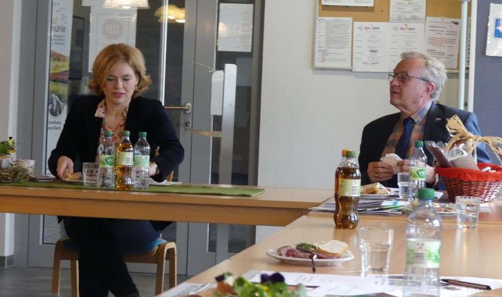 Bu: Kleine Verkostung der Produkte des Hofguts Neumühle: Bundeslandwirtschaftsministerin Julia Klöckner und Bezirkstagsvorsitzender Theo Wieder