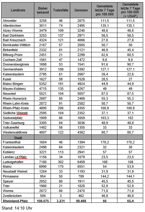 Die oben genannten Zahlen entsprechen den in der Meldesoftware des Robert Koch-Instituts übermittelten laborbestätigten Fällen einer COVID-19 Erkrankung mit Meldeadresse in Rheinland-Pfalz. Diese werden von den Gesundheitsämtern über die Landesmeldestelle beim Landesuntersuchungsamt an das Robert Koch-Institut übermittelt. Diese Zahlen können vereinzelt von den durch die Kreisverwaltungen kommunizierten Zahlen abweichen.