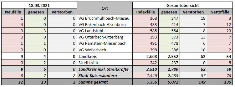 5.356 Indexfälle in Stadt und Landkreis, 5.072 genesenen Personen, 149 Todesfälle, 18.03.2021