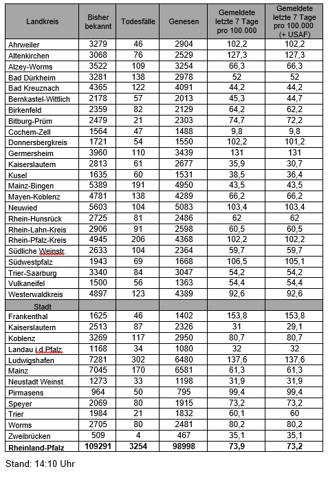 Die oben genannten Zahlen entsprechen den in der Meldesoftware des Robert Koch-Instituts übermittelten laborbestätigten Fällen einer COVID-19 Erkrankung mit Meldeadresse in Rheinland-Pfalz. Diese werden von den Gesundheitsämtern über die Landesmeldestelle beim Landesuntersuchungsamt an das Robert Koch-Institut übermittelt. Diese Zahlen können vereinzelt von den durch die Kreisverwaltungen kommunizierten Zahlen abweichen.