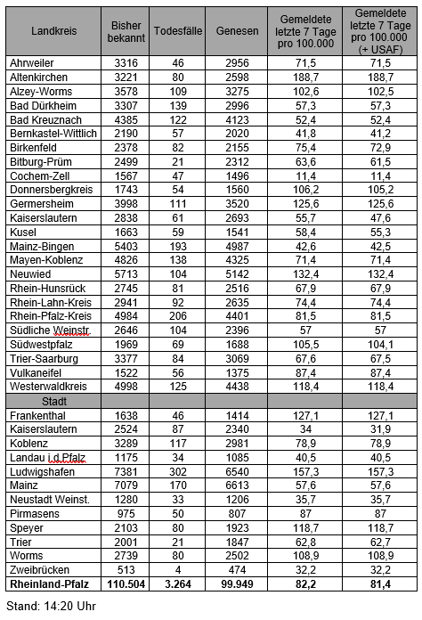 Die oben genannten Zahlen entsprechen den in der Meldesoftware des Robert Koch-Instituts übermittelten laborbestätigten Fällen einer COVID-19 Erkrankung mit Meldeadresse in Rheinland-Pfalz. Diese werden von den Gesundheitsämtern über die Landesmeldestelle beim Landesuntersuchungsamt an das Robert Koch-Institut übermittelt. Diese Zahlen können vereinzelt von den durch die Kreisverwaltungen kommunizierten Zahlen abweichen.