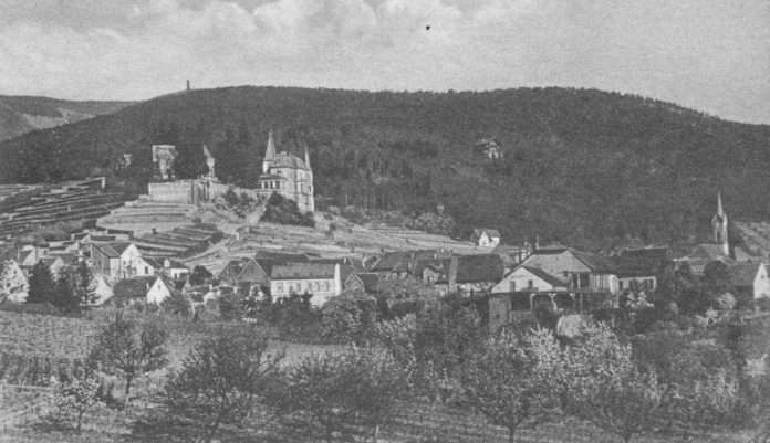 Bildunterschrift: Blick auf Haardt und das Haardter Schloss bei Neustadt – einmal aus dem Jahr 1910 und einmal im Frühjahr 2021 (Quelle: alte Ostkarte/Bildautor unbekannt sowie Biosphärenreservat Pfälzerwald)