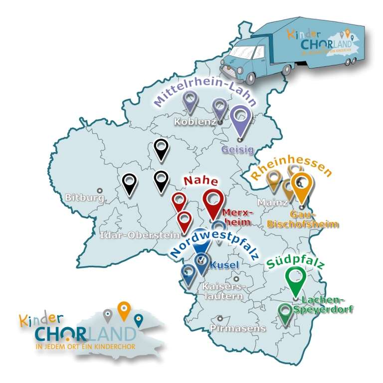 In Absprache mit den Teilnehmenden treffen sich die Kinderchöre in fünf Regionen im Land: Region Vorder-/Südpfalz, in Neustadt/Weinstraße, Ortsteil Lachen-Speyerdorf. Die Region Nordwestpfalz trifft sich in Kusel und die Region Nahe in Merxheim. In der Region Rheinhessen hält der Singbus in Gau-Bischofsheim und abschließend in der Region Mittelrhein-Lahn, in Geisig bei Nassau.
