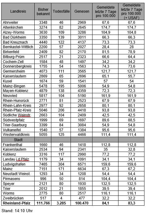 Die oben genannten Zahlen entsprechen den in der Meldesoftware des Robert Koch-Instituts übermittelten laborbestätigten Fällen einer COVID-19 Erkrankung mit Meldeadresse in Rheinland-Pfalz. Diese werden von den Gesundheitsämtern über die Landesmeldestelle beim Landesuntersuchungsamt an das Robert Koch-Institut übermittelt. Diese Zahlen können vereinzelt von den durch die Kreisverwaltungen kommunizierten Zahlen abweichen.