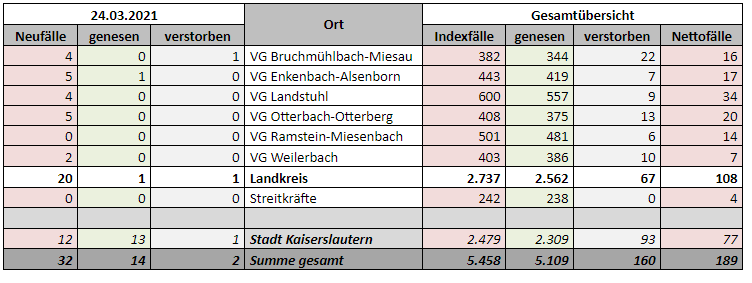 5.458 Indexfälle in Stadt und Landkreis, 5.109 genesenen Personen, 160 Todesfälle, 24.03.2021