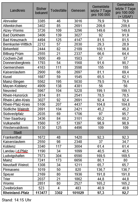 Die oben genannten Zahlen entsprechen den in der Meldesoftware des Robert Koch-Instituts übermittelten laborbestätigten Fällen einer COVID-19 Erkrankung mit Meldeadresse in Rheinland-Pfalz. Diese werden von den Gesundheitsämtern über die Landesmeldestelle beim Landesuntersuchungsamt an das Robert Koch-Institut übermittelt. Diese Zahlen können vereinzelt von den durch die Kreisverwaltungen kommunizierten Zahlen abweichen.