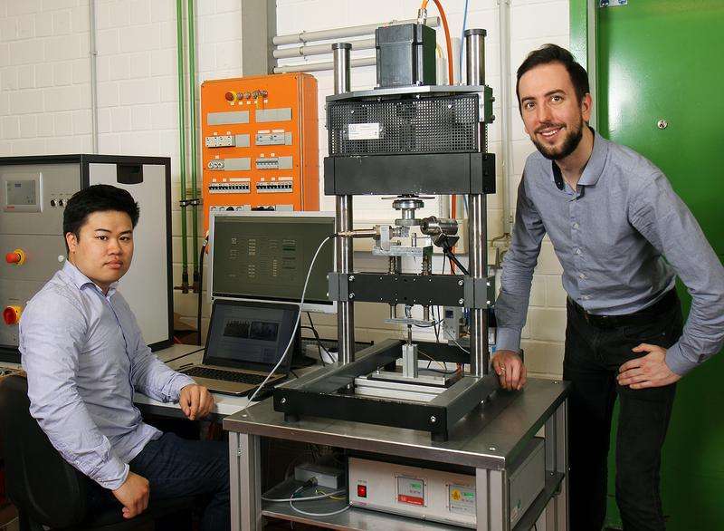 Bu: Für ihre Prüfmaschine haben die Forscher eine neue Software entwickelt. Im Bild zu sehen sind Minh-Hai Le and Sebastian Kamerling. Foto: Koziel/TUK