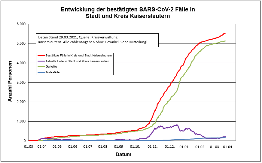 Aus der vergangenen Woche wurden 2 Todesfälle nachgemeldet (1x Stadt und 1x LK KL), die in die heutige Statistik einfließen. Corona-Zahlen für die Stadt und den Landkreis Kaiserslautern können Sie dieser Statistik entnehmen: