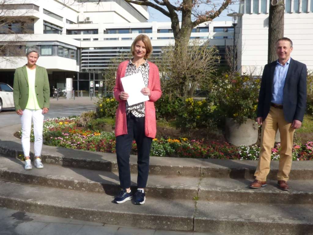 – Foto 2: Wechsel bei der Stadtbildpflege (v. l.) Bürgermeisterin Beate Kimmel, die neue Werkleiterin Andrea Buchloh-Adler und ihr Vorgänger Rainer Grüner.