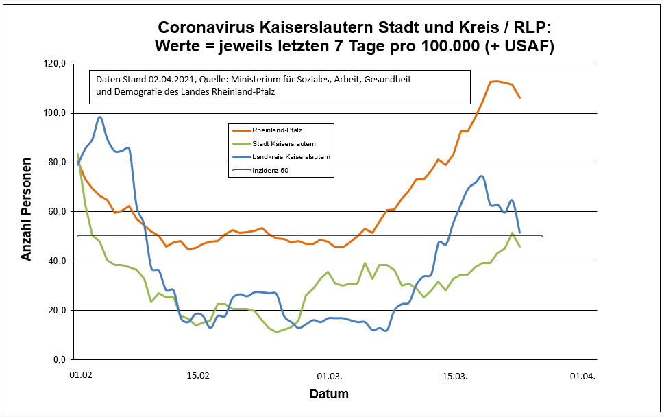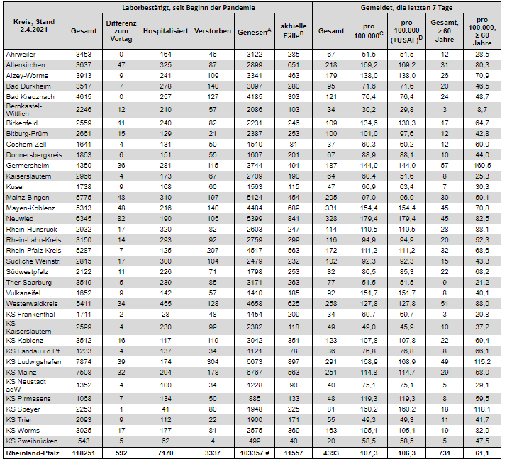 Coronavirus SARS-CoV-2: Aktuelle Fallzahlen für Rheinland-Pfalz, (Datenstand vom 02.04.2021, 11:10 Uhr)