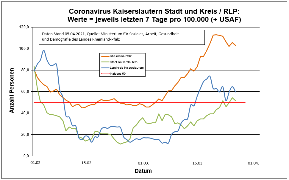 Coronavirus KL: letzten 7 Tage pro 100.000 (+ USAF)- Stadt 51,6 ; Landkreis 59,7 ; RLP 103