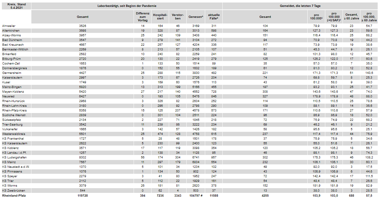 Coronavirus SARS-CoV-2: Aktuelle Fallzahlen für Rheinland-Pfalz, (Datenstand vom 05.04.2021, 11:10 Uhr)