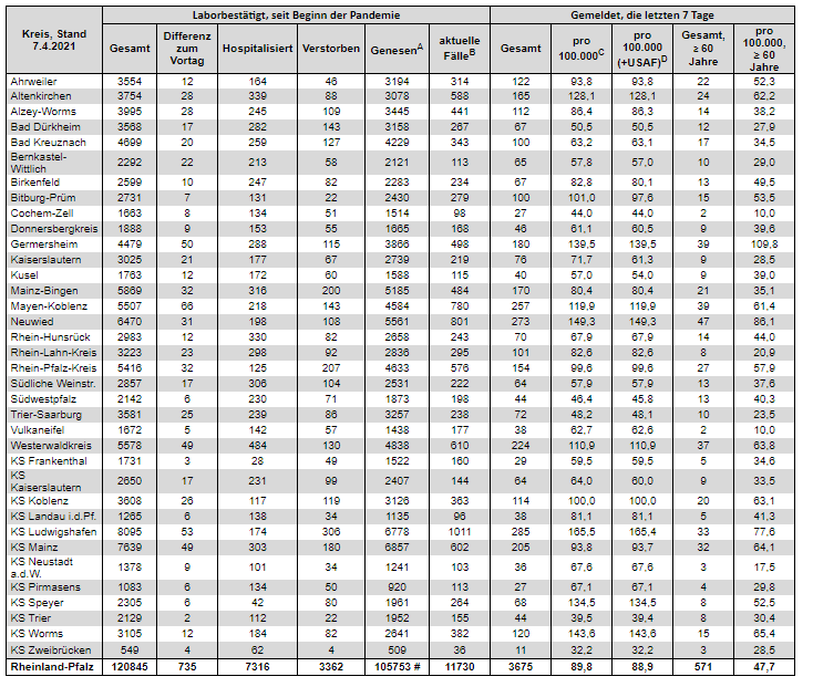 Coronavirus SARS-CoV-2: Aktuelle Fallzahlen für Rheinland-Pfalz, (Datenstand vom 07.04.2021, 14:10 Uhr)