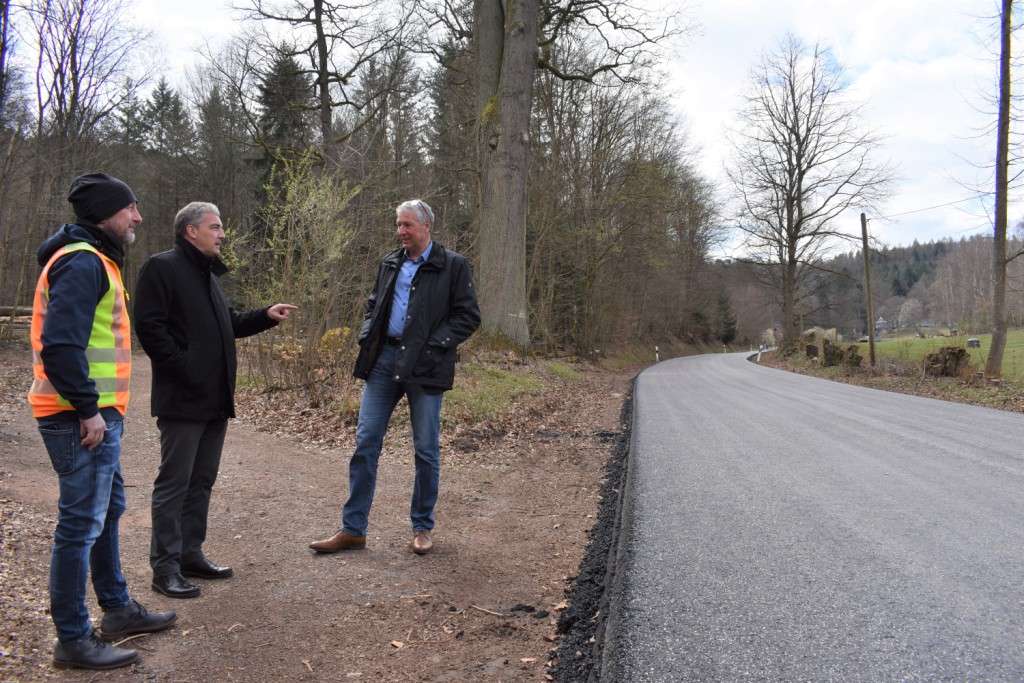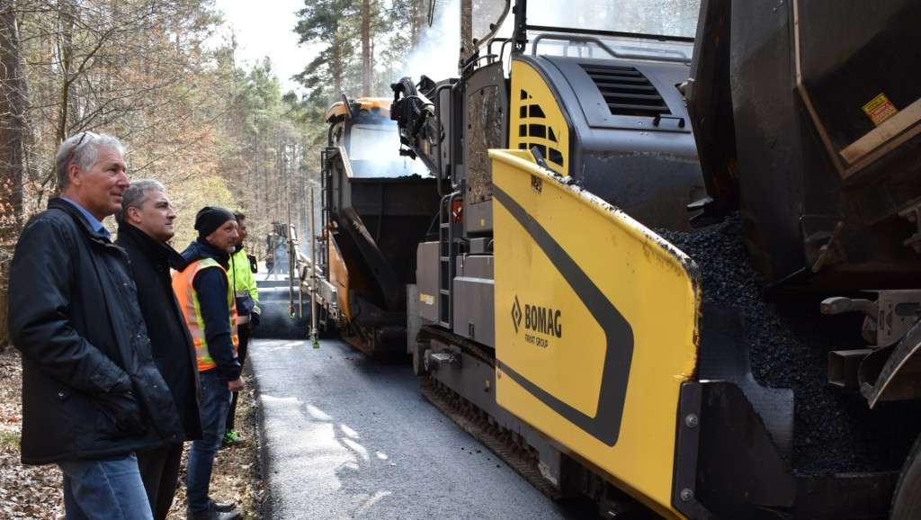 Nach dem Asphalteinbau erfolgen noch Restarbeiten wie das Herstellen der Bankette und Markierungsarbeiten. „Wenn es die Witterung zulässt, wird die Straße bereits nächste Woche fertig und wieder befahrbar sein“, so der Beigeordnete Peter Kiefer, der es sich nicht nehmen ließ, den raschen Fortgang der Arbeiten am Nachmittag selbst in Augenschein zu nehmen. Erfreut zeigte sich der Baudezernent aber auch über die sehr gute Kooperation im Vorfeld: „Da die Sanierung unter Vollsperrung durchgeführt werden muss, wurde in enger Abstimmung mit der Landesforstverwaltung und der Anwohner eine Umleitung über Forstwege ausgeschildert. Dank der guten und kooperativen Planung ist es gelungen, die Einschränkungen zeitlich auf ein absolutes Minimum zu reduzieren. Mein Dank gilt allen Beteiligten!“